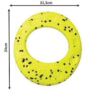 O brinquedo resistente Reflex Flyer é um brinquedo de buscar durável , projetado para proporcionar muita diversão. Sua estrutura flexível e elástica é feito do mesmo material utilizado nas solas dos melhores tênis de corrida, que porporcionam resistência e elastidade ao brinquedo. O que proporciona um quique dinâmico e empolgante. Comprovadamente resistente, este brinquedo é garantido para durar em brincadeiras de buscar intensas.Além de resistente, o Kong Reflex Flyer possui propriedades auto-regenerativas que permitem reparar marcas de mordiscos. Com este brinquedo, seu cão poderá se divertir por muito tempo com interações instintivas e prazerosas.