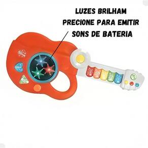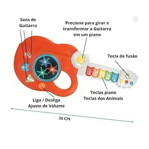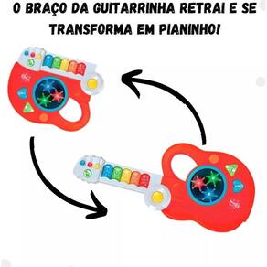 Guitarra Piano e Tambor Musical da Braskit.Com a Guitarrinha 3 em 1 a Diversão Não Vai Ter Fim! Além de Guitarra, Ela Se Transforma em Pianinho com Um Mini Tambor Para Aprimorar Ainda Mais a Composição! o Braço da Guitarrinha Retrai e Se Transforma em Pianinho!Com Luzes Brilhantes, Sons de Bateria e Sons de Guitarra.A Guitarra Mede Aproximadamente 37cm de Comprimento