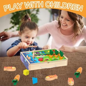 - Brinquedos interativos para pais e filhos: a caixa de jogos de madeira também vem com uma função de armazenamento, para que você possa armazenar todos os peixes, cenouras e blocos de madeira juntos na caixa de madeira. A caixa de jogos vem com uma corda suspensa para facilitar o transporte ou a suspensão. Este brinquedo sensorial é a ferramenta perfeita para os pais passarem o tempo livre com seus filhos e participarem do crescimento deles, melhorarem a interação entre pais e filhos durante as brincadeiras e ajudarem seu filho a desenvolver o interesse em aprender.