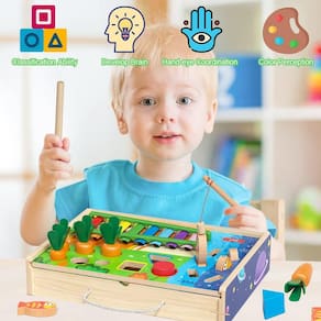 - Caixa de jogo multifuncional 4 em 1: este conjunto de brinquedos educacionais pré-escolares para crianças pequenas inclui 6 cenouras, 6 peixes magnéticos de madeira, 3 blocos de formas geométricas, xilofone de percussão de 8 cores, 1 vara de pescar e 1 aldrava. 4 jogos diferentes oferecem exercícios sensoriais e várias diversões para seus filhos.