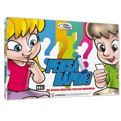 Brinquedo Infantil Jogo Pensa Rápido Super Jogos Pais & Filhos Uma disputa divertida para testar seus conhecimentos. O vencedor será quem for rápido e tiver o maior conhecimento. Com a ampulheta em ação o jogador deverá dizer as palavras correspondentes da carta. Se ele conseguir, recebe a carta para sua pontuação final. Se não, ela é descartada. No final, aquele que tiver a maior quantidade de cartas em seu poder será o vencedor.Excelente jogo para se jogar com os amigos ou em família, reúna a galera e dispute para ver quem será o vencedor deste desafio.Desenvolve a atenção, concentração, e conhecimento gerais, de uma maneira fácil e muito divertida. Contém:180 cartas, 01 ampulheta e 01 suporte em cartão. Faixa etária indicada:A partir dos 08 anos.Selo INMETRO 003724/2019