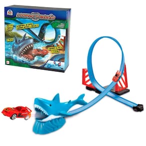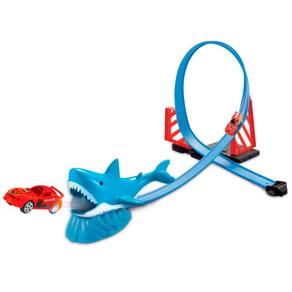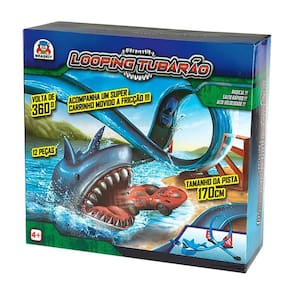 A super pista looping tubarão Pista flexível para ser montada formando um looping, onde o carrinho faz uma volta em alta velocidade e sai pelo grande tubarão. Acompanha um carrinho movido a fricção. Auxilia na coordenação motora, criatividade e estimula a imaginação de fantasia da criançada A volta do carrinho é de 360 Garanta já o seu