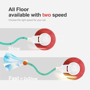 - Dois modos de interação: pressione e segure o botão por 1 segundo para ativar o modo lento (a luz vermelha pisca e depois desliga). É adequado para gatos tímidos, menos ativos ou mais velhos. Desligamos especificamente a luz desses gatos para evitar assustar ou prejudicar seus olhos. Pressione o botão novamente brevemente para mudar para o modo rápido (a luz azul acende continuamente). Este modo é aplicável a todas as superfícies, como tapetes e pisos duros, e é ideal para gatos adultos ousados e enérgicos