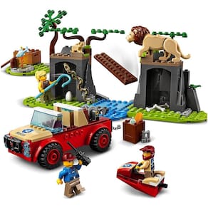 Em Lego City Off-Roader Para Salvar Animais Selvagens, um filhote de leão está preso perto de um ninho de píton, depois que a ponte frágil que cruzou desabou. A bordo do LEGO City 4+ Wildlife Rescue Off-Roader, use o guincho do veículo para cruzar o rio e, em seguida, envie a heroína da TV LEGO City, Jessica Sharpe, para realocar a cobra.