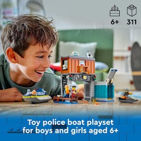 LEGO Brinquedo de barco e esconderijo de bandidos da polícia da cidade, presente divertido para meninos, meninas e crianças a partir de 6 anos que amam brinquedos de faz de conta, inclui um brinquedo - Esconderijo dos bandidos e brinquedo de barco da polícia – as crianças podem participar em missões divertidas de captura de bandidos com este conjunto de brinquedo de lancha e esconderijo da polícia da cidade de LEGO para crianças a partir de 6 anos - Conteúdo da embalagem: – Tudo o que as crianças precisam para construir uma lancha, brinquedo de jet ski, doca com contêineres de carga, mini figura de policial, 2 miniaturas vigaristas e um boneco de buldogue - Recursos e funções – as crianças podem ativar o balde da armadilha para peixes e a função de fuga rápida e guardar o saque oculto dos bandidos - Inclui um pôster "procurado" – Com a permissão de um adulto, as crianças podem escanear o código QR nas instruções de construção ou na caixa para uma divertida aventura em vídeo da polícia da cidade de LEGO - Um presente LEGO para qualquer ocasião – Dê este conjunto de brinquedo policial como presente de feriado ou qualquer dia para crianças a partir de 6 anos que amam brinquedos e barcos cheios de ação - Descubra um mundo de brincadeiras imaginativas – as crianças liberam mais diversão e aventuras quando adicionam este conjunto a outras pessoas (vendidas separadamente) da coleção LEGO City - Uma cidade sem limites – LEGO City é um lugar onde as crianças podem libertar sua imaginação ilimitada, com estruturas, veículos e cidadãos que as motivam a construir, criar, explorar e brincar