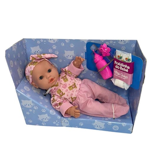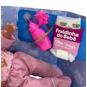 Contém: 1 peça boneca , 1 mamadeira , 1 peça chupeta e 1 peça fraldinha