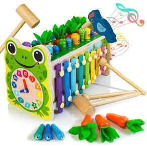 -?Educacional e divertido?Bata em estacas de madeira e xilofone com um martelo, pegue rabanetes e minhocas com mãos pequenas e alterne as marchas para ajudar as crianças a melhorar a coordenação mão-cérebro, a percepção musical e as habilidades motoras finas. O relógio do brinquedo também pode ajudar as crianças a aprender números e horas na primeira infância. Os brinquedos de martelo para crianças de 1 a 3 anos são um bom presente para ensino e entretenimento.