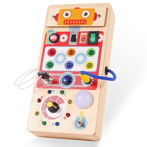 - ?Aprendendo, brincando e explorando?O Robot Busy Board com LED pode identificar diferentes cores, interruptores. O quadro de atividades infantis pode promover o desenvolvimento cerebral das crianças. Este quadro ocupado não apenas acende o LED, mas também tem configurações de som para atrair a atenção do seu filho. Este brinquedo sensorial para crianças de 3 anos pode exercitar o pensamento lógico, as habilidades práticas e exploratórias do seu bebê