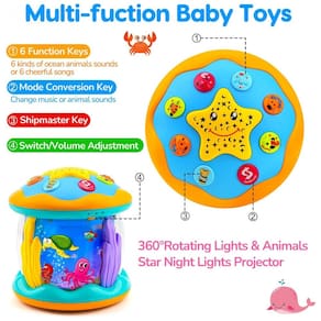 O brinquedo musical Ocean Projector Rotating Tsomtto é um projetor infantil com tema oceano que combina luzes, rotação de figuras e sons para estimular bebês durante o tummy time, engatinhar e os primeiros passos. A estrutura simula um pequeno aquário com animais marinhos que giram em 360°, acompanhados por iluminação azul e colorida, criando um efeito visual de mundo subaquático adequado para uso em ambientes internos.