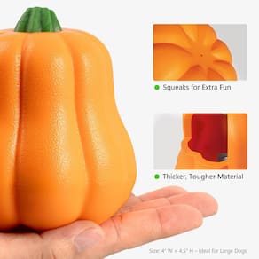 Feito de TPR espessado de qualidade alimentar, este adorável brinquedo de abóbora é resistente, mas seguro para cães de médio a grande porte. Cumes divertidos e um caule verde promovem a saúde bucal e aliviam o tédio e a ansiedade com um guincho embutido. Ótimo para buscar em terra ou na água, ele salta de forma imprevisível para aumentar a emoção. Fácil de limpar e perfeito como um presente atencioso, completo com suporte confiável e sem preocupações