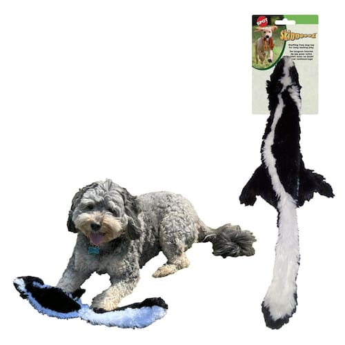 SPOT Skinneeez Skunk Brinquedo de pelúcia para cães de 58 cm sem enchimento – Design realista com 2 Squeakers – Poliéster durável e macio para cães de médio e grande porte – puxar, buscar e agitar