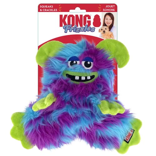 KONG Frizzles é um brinquedo leve, com tamanho razoável, que é convidativo para brincadeiras dentro de casa. Mesmo que atirado em algum objeto de valor, como é leve, dificilmente causará um prejuízo. Possui apito e estalidos que tornam a brincadeira ainda mais atrativa e duradoura. O seu corpo achatado o torna fácil agarrar por cães de qualquer tamanho.