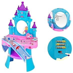 Brinquedo Penteadeira Musical Castelo Princesa Com Luz E Som A Penteadeira Musical Baby Style tem um lindo formato de Castelo digno de uma Princesa Um camarim próprio com mais de 30 acessórios e jóias, e claro o mastro e uma coroa com detalhes apaixonantes para ficar ainda mais linda. A penteadeira tem um espelho perfeito para as princesas se admirarem. Suas cores são vibrantes e harmonizam entre si. Tudo pensado para o faz de conta estar à altura desta princesa.