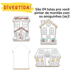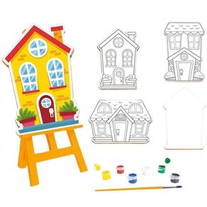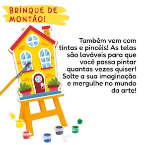 Acompanha um cavalete de plástico, tintas coloridas e 4 telas de madeira com 24 cm cada - sendo 3 com desenhos de casinhas superfofas para pintar e 1 tela em branco para a criança criar a sua própria casinha dos sonhos