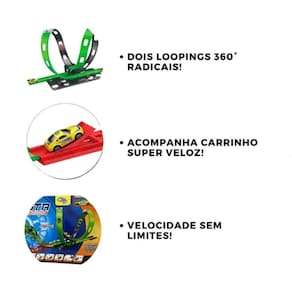 Brinquedo pista corrida duplo 360 hot weels looping loop ----loja oficial do click compras na internet---- Somos um dos melhores vendedores do site, nossa missão é atender com amor e carinho nossos clientes, oferecendo sempre o melhor atendimento e produtos de excelência. São milhares de produtos entregues e clientes satisfeitos. ----loja oficial do click compras na internet---- Produto em Diversão garantida para todas as idades Tá preparado pra emoção em dose dupla Com a pista duplo 360 street looping, a velocidade entra no modo turbo Dois loopings radicais, carrinhos voando nas curvas e muita adrenalina pra deixar a brincadeira ainda mais divertida. É montar, acelerar e curtir manobras insanas desafie a gravidade e divirta-se pra valer Características: - material: plástico, metal; - inmetro: 004588/2024; - idade recomendada: a partir de 03 anos. - conteúdo: 1 pista montável e 1 carrinho. - dimensões: 32cm de altura x 31cm de largura x 95,2cm de comprimento. Homologação Inmetro: IP-BRI-2218/2021-56 Marca: Não Informado