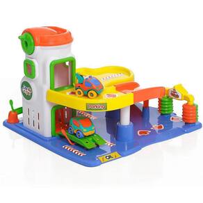 É uma plataforma super colorida e recheada de interações, vem com um carrinho e um guincho.
