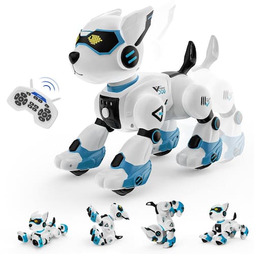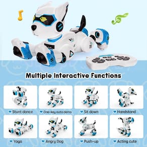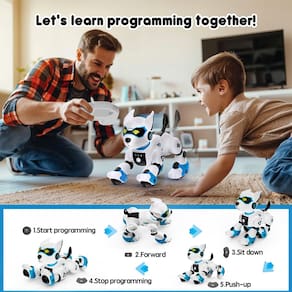 Robot Dog Toys -?Smart Programmable Robot Dog?As crianças podem liberar sua imaginação e criatividade no modo de programação, definindo várias ações interessantes. Basta pressionar os botões correspondentes e o brinquedo de cão-robô executará ações na sequência programada: Avançar/Para trás/virar à esquerda/direita/Stunt Dance/Sitdown/Handstand/Yoga/Angry/Push-up/Acting Cute/Imitation Show. Enquanto brincam, as crianças aprendem e desenvolvem habilidades de raciocínio lógico e concentração. -?Fácil de controlar?As crianças podem controlar facilmente o cão-robô com comandos de voz simples, sem precisar se lembrar de botões complexos do controle remoto, fazendo com que se sintam como se estivessem interagindo com um animal de estimação real, o que ajuda a melhorar suas habilidades linguísticas. A função de controle por gestos permite que as crianças controlem a direção do cão-robô com movimentos das mãos. Quando você toca no queixo do cão-robô, ele responde com várias ações e sons fofos, como um cachorro real. -?Animal de estimação robótico interativo?O cão-robô pode dançar 5 ritmos musicais diferentes, permitindo que as crianças aproveitem a diversão trazida pela música. Ele também pode imitar os sons e ações de 10 animais diferentes, ajudando as crianças a aprender sobre os hábitos e comportamentos de vários animais durante brincadeiras interativas. O cão-robô para crianças vem pré-carregado com várias histórias para dormir, guiando as crianças a um sono confortável com uma narrativa relaxante. Este brinquedo robô inteligente para cães é um presente perfeito para meninos, meninas e crianças. -?Ótimos brinquedos e presentes para crianças?O brinquedo robô para cães possui uma bateria modular recarregável embutida de 3,7 V. Após 60 minutos de carregamento por USB, o cão robô inteligente proporcionará 90 minutos de diversão. Feito de plástico ABS, o cachorrinho robô tem uma superfície lisa e é resistente a quedas. Ótimo presente para meninos e meninas. Os brinquedos robôs para animais de estimação se tornarão seus melhores companheiros. -?Adorável animal de estimação robô para crianças?Você quer que seus filhos experimentem a alegria de ter um animal de estimação sem se preocupar em cuidar dele e passear com ele? Nosso cão robô é a escolha ideal. Você só precisa carregar este brinquedo robô para cães, sem se preocupar com as outras tarefas tediosas de cuidar de um cachorro de verdade.