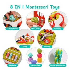 ?Brinquedos Montessori 8 em 1?Brinquedo multifuncional para manter o bebê ocupado. Os bebês aprendem a colocar blocos dentro e fora das caixas, combinar formas, empilhar blocos, puxar cordas, girar ventosas e muito mais. É um brinquedo de aprendizagem para educação infantil, pode exercitar a coordenação motora e olho-mão fina.
