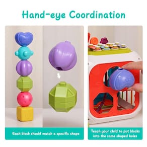 -?Brinquedos classificadores de formas 8 em 1?Brinquedo multifuncional para manter o bebê ocupado. Os bebês aprendem a colocar blocos dentro e fora das caixas, combinar formas, empilhar, girar ventosas... nosso brinquedo montessori pode ajudar nas habilidades motoras finas, na coordenação olho-mão e na classificação de formas.