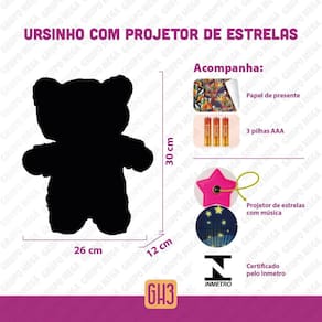 Especificações técnicas: Marca: GH3 Modelo: Projetor de estrelas de pelúcia Distribuidor oficial: GH3 Shop Material: 100% poliéster Dimensões: 26 x 30 x 12cm Larg x alt x profundidade Peso: 200g.