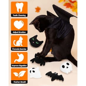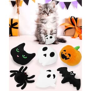- Brinquedos de Halloween Catnip: O pacote vem com 6 designs diferentes de abóbora, gato preto, fantasma, morcego, aranha e caveira. Com a erva-dos-gatos cheirosa, eles podem ajudar a aliviar o cansaço do gatinho e ajudá-lo a se manter saudável.