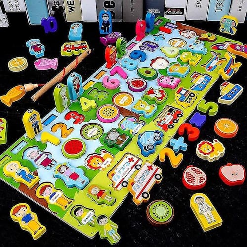 Características dos brinquedos de pesca: Brinquedo de madeira educacional Caráter multifuncional Forma cognitiva Matching Building Block Animal Fishing Busy Board Toys | Brinquedos de matemática Categoria do produto: Quebra-cabeça Material do produto: Madeira Idade: 3Y+Tamanho do produto Placa logarítmica: 45* 18cm Vara de pesca: 15cm Função do produto: treinar crianças cognição do trânsito, animais, frutas, números, pesca, ocupação e personagens, e exercitar a capacidade de coordenação olho-mão