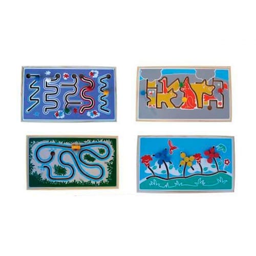 Conjunto confeccionado em madeira, contendo 04 painéis de estimulação com diferentes formatos e movimentos, impresso em silk screen. Acondicionado em caixa de papelão. Produto de qualidade comprovada.