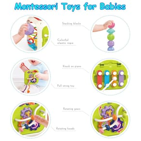 - Brinquedos Montessori 7 em 1: esses brinquedos didáticos permitem que seus filhos joguem 7 jogos em 1 brinquedo: o brinquedo sensorial pode ser utilizado para exploração espacial por corda elástica para crianças pequenas, combinação de formas de blocos de atividades, blocos de empilhamento, brinquedos com cordão, engrenagens giratórias, miçangas giratórias e xilofone para bebês.