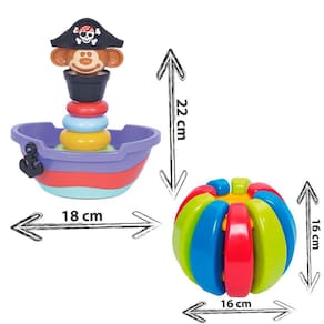 Marca: mercotoys Faixa Etária: Empilha Baby Pirata acima de 5 meses Bola Didática em Gomos acima de 9 meses Dimensões: Empilha Baby Pirata: 17 x 13 x 22 cm Bola Didática em Gomos: 16 x 16 x 16 cm