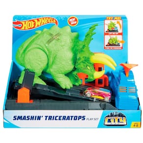 Se prepare para mais aventuras! Um furioso dinossauro está solto pela rua principal da cidade. Com o Conjunto Hot Wheels Mattel City Smashin’ Triceratops os pequenos salvam a Hot Wheels City de um gigante Triceratops. A pista acompanha um dinossauro, um lançador em forma de caminhão e um veículo.