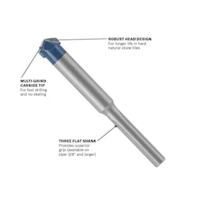 Bosch NS600 1/2 Broca de azulejo de pedra natural - Cabeça multimoagem – projetada com várias bordas de corte para materiais de azulejos mais duros - Perfuração rápida em materiais duros – proporciona uma perfuração 20% mais rápida do que a broca de vidro e azulejo - Ponta de carboneto especializada – centros para perfuração sem skate e maior facilidade de uso - Material de carboneto de alta qualidade – oferece vida útil mais longa em materiais duros - Especialmente projetado para azulejos de pedra natural – oferece uso específico para estes azulejos especiais