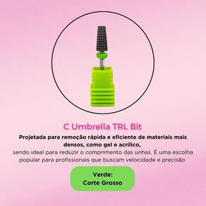 A broca de unhas C Umbrella TRL Bit de corte grosso é uma ferramenta projetada especificamente para a remoção eficiente e rápida de materiais espessos nas unhas, como gel, acrílico e polygel. Com seu formato em "umbrella" é ideal para realizar cortes profundos e rápidos, removendo grandes quantidades de produto de maneira eficaz, o que facilita o trabalho em processos de desmontagem e retoque de alongamentos. Fabricada em tungstênio, essa broca é resistente ao desgaste e mantém o desempenho por longos períodos. Seu corte grosso é ideal para técnicos que precisam de uma ferramenta potente para remover camadas mais densas com rapidez, garantindo também a segurança e precisão no trabalho, evitando danos à unha natural. É uma ótima escolha entre profissionais devido à sua eficiência, durabilidade e capacidade de oferecer um acabamento limpo em menos tempo.