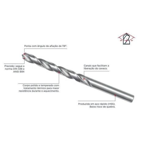 A ponta da broca possui um ângulo de afiação de 118º, proporcionando precisão e seguindo as normas DIN338 e ANSI B94. Além disso, seu corpo é polido e temperado com tratamento térmico para maior resistência durante o aquecimento. Os canais presentes na broca facilitam a liberação do cavaco, evitando acúmulo e melhorando o desempenho.