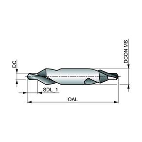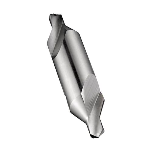 Broca de centrar (broca e escareador combinados) com formato cônico reto 60°, extremidade dupla e corpo cilíndrico, tamanho BS5 com diâmetro de broca 3/16", um diâmetro de corpo de 7/16" e comprimento total de 2.1/2", de acordo com padrão BS 328 para produzir furos centrais formato A, feita em HSS e acabamento brilhante para usinagem de aços livre, carbono puro e ligado e ferro fundido cinzento.