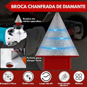 Broca de Chanfro Diamantada M14 para Esmerilhadeira Soldada a Vácuo - Marca: Charbs - Referência: CH0293 - Rosca M14 para esmerilhadeira - Diâmetro: 50mm - Gramatura: Grão 80 - Chanfro de 60 graus - Versatilidade Superior: Ideal para chanfrar furos em vidro, granito, mármore, pedras, cerâmica e porcelanato, além de criar entalhes laterais arredondados em tubos e linhas de cabos elétricos. - Desempenho de Alta Velocidade: Alta concentração de diamante para cortes rápidos e uma vida útil prolongada. - Resultados Consistentes: Adequado para uso em condições secas ou úmidas, garantindo precisão em qualquer situação. - Dimensões da Embalagem: 9 x 5 x 5cm - Peso: 260 gramas - Garantia: 90 dias