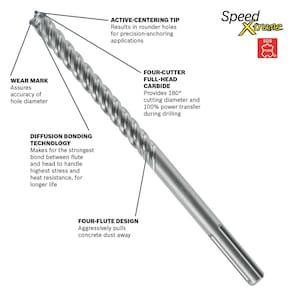 Bosch HCFC5010 Broca de martelo rotativo de carboneto de cabeça completa SDS-max® SpeedXtreme™ 1/2 pol. x 20,3 cm - Design de broca SDS-Max de longa duração – fabricado com cabeça 100% de carboneto e design de quatro cortadores, o que a torna a broca de longa duração para perfuração em concreto reforçado e agregados duros - Tecnologia de ligação por difusão – oferece vida útil 5x x x concorrência, para a ligação mais forte disponível - Design de cabeça de quatro cortadores – oferece diâmetro de corte de 180° e 100% de transferência de energia durante a perfuração - Quatro ângulos laterais simétricos de 90° – crie uma ponta larga e afiada para cortar agressivamente o material resistente como o concreto com vergalhão - Ponta de centralização ativa – resulta em furos mais redondos para aplicações de fixação de precisão, com uma marca de desgaste para ajudar a proporcionar tolerância de precisão ao diâmetro do furo
