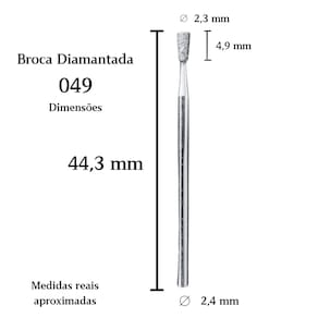 O kit contém 5 brocas diamantadas modelo 049 Brilho, com formato cônico invertido estreito, indicadas para acabamento e nivelamento controlado em áreas menores. O perfil mais alongado e afilado da ponta permite maior precisão e controle durante ajustes localizados, sem ampliar a área de contato.
