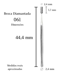 Dimensões aproximadas: comprimento total de 44,4 mm, haste padrão universal de 2,4 mm e ponta cilíndrica diamantada de 2,4 mm de diâmetro por 5,7 mm de altura.