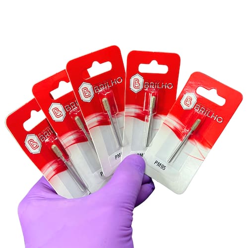 O kit contém 5 brocas diamantadas modelo PM 095 Brilho, no formato cilíndrico com topo arredondado. Indicada para nivelamento, alisamento e acabamento em áreas amplas, combina eficiência abrasiva com maior segurança próximo à pele, reduzindo riscos de cortes agressivos.