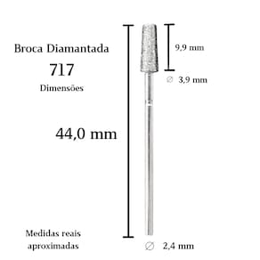 Dimensões aproximadas: comprimento total de 44,0 mm, ponta diamantada com 9,9 mm de altura, diâmetro máximo de 3,9 mm e haste padrão universal de 2,4 mm.