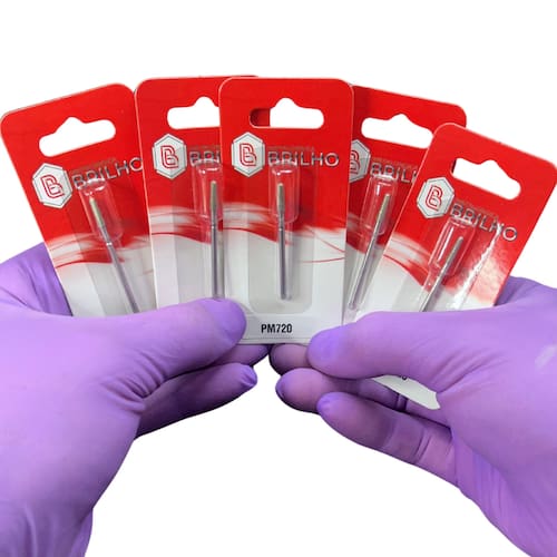 O kit contém 5 brocas diamantadas modelo PM 720 Brilho, no formato tronco-cônico com ponta arredondada. São amplamente utilizadas por profissionais para nivelamento uniforme de gel, acrílico ou lâmina ungueal, além de acabamentos próximos à cutícula com total controle e segurança.