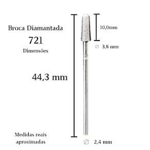 Dimensões aproximadas: comprimento total de 44,3 mm, ponta diamantada de 10,0 mm de altura, diâmetro de 3,8 mm e haste padrão universal de 2,4 mm.