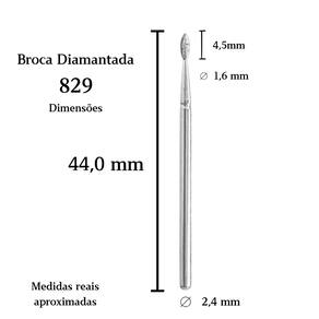 Dimensões aproximadas: comprimento total de 44 mm, ponta diamantada de 4,5 mm, diâmetro máximo de 1,6 mm e haste padrão universal de 2,4 mm.