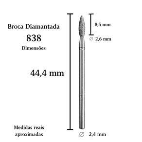 Dimensões aproximadas: comprimento total de 44,4 mm, ponta diamantada de 8,5 mm de altura, diâmetro máximo de 2,6 mm e haste padrão universal de 2,4 mm.