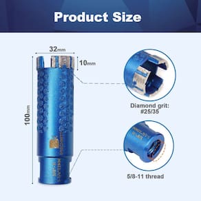 Característica: 1. Quando você estiver construindo/remodelando um banheiro ou cozinha, como instalar a torneira na bancada, você precisará fazer furos no granito sem rachá-los, para que você possa usar nossa broca de ponta de diamante para tornar esses furos muito precisos 2. Para um melhor acabamento e maior duração da broca de diamante, você pode começar em um pequeno ângulo para passar pela superfície acabada superior, então com uma leve pressão trabalhe cuidadosamente através do granito. 3. Usar esta broca de diamante em uma rebarbadora vai gostar de uma faca quente através da manteiga 4. A vida média da serra de granito depende de vários fatores, incluindo o tipo de agregado e material, sua espessura/dureza, resfriamento e uso adequados 5. Pacote: Fornecido em caixa de plástico quadrada (20-75 mm), caixa de papel (mais de 75 mm) 6. Este é o cortador de buraco de granito ideal para rocha, bricolage, trabalhadores de cerâmica, trabalhadores de construção, empreiteiros gerais e comerciantes 7. A qualidade cria uma vida melhor. Todos os nossos produtos são submetidos a rigorosos testes de qualidade. Queremos que todos os produtos sejam reconhecidos por sua qualidade e durabilidade - Tamanho -- 1 peça broca de núcleo de 32 mm (32 mm), altura do diamante 10 mm, comprimento total 100 mm, grão de diamante nº 25/35, comprimento de trabalho 80 mm, rosca 5/8-11 da broca de granito - Ampla aplicação -- A broca de diamante funciona muito bem para perfurar furos a seco através do balcão de bloco de tijolos de concreto reforçado com pedra dura de mármore de granito, usar água pode prolongar a vida útil - Matéria-prima de super qualidade - usando tecnologia soldada a laser, melhora o desempenho dos segmentos, evite segmentos desligados durante o processo de perfuração. A camada protetora de brasagem a vácuo na superfície do núcleo de aço oferece corte limpo e proteção do núcleo de aço - Perfuração rápida e suave - Cria uma perfuração rápida e estável, você pode perfurar suavemente sem bordas quebradas - Máquina -- rebarbadora (preste atenção! Se você perfurar granito grosso, recomendamos que você adicione água suficiente para ajudar a resfriar as brocas, o que pode prolongar a vida útil)