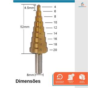 A broca escalonada de 4-20mm da Starfer é uma ferramenta de corte projetada para perfurar metais, madeira e outros materiais duros. Ela possui um formato cônico, com múltiplas etapas de diâmetros crescentes ao longo do corpo da broca.A broca escalonada é chamada assim porque cada etapa possui um diâmetro diferente, permitindo que você faça furos de tamanhos variados sem precisar trocar de broca. No caso da broca escalonada 4-20mm da Starfer, ela é capaz de perfurar materiais com diâmetros que vão de 4mm até 20mm.Para uso em furadeiras.Especificações técnicas:Material: Aço Rápido.9 escalas: 4mm, 6mm, 8mm, 10mm, 12mm, 14mm, 16mm, 18mm, 20mm.Diâmetro da haste: 8mm.Embalagem: Cartela blister dupla com 1 unidade.Marca: StarferRef.: 2416824