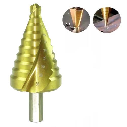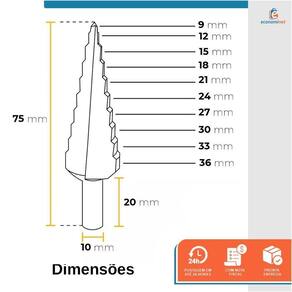 A broca escalonada de 9-36mm da Starfer é uma ferramenta de corte projetada para perfurar metais, madeira e outros materiais duros. Ela possui um formato cônico, com múltiplas etapas de diâmetros crescentes ao longo do corpo da broca.