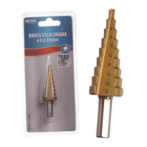 Descricao A Broca Escalonada da Corneta permite um inicio de furacao rapida, possibilitando uma furacao em varias medidas com uma precisao elevada e um controle maior da furacao com qualidade e resistencia seja para uso ou domestico!- Caracteristicas do produto: Brocas em aco rapido HSS com tratamento termico e revestimento de titanio. Ideal para furos precisos e rapidos, para materiais como latao, madeira, chapas de baixo teor e plasticos.- Indicacao: Para furo em materiais como latao, madeira, chapas de baixo teor e plasticos. Para uso em parafusadeira e furadeira.- Instrucoes de uso: A broca deve ser refrigerada com oleo ou pasta durante o furo, nao deve ser usada a seco para nao danificara ponta de corte.- Tabela de velocidade: Broca escalonada 4-20mm Max. Rpm 800 - 250- Atencao: nao exceda a velocidade de perfuracao recomendada.- Cuidados: Para reduzir o risco de lesoes, sempre use adequadamente equipamento de protecao individual (oculos de protecao, botas, luvas, etc...) Manter fora do alcance das criancas.*Imagens meramente ilustrativas.Especificacao Tecnica - Dimensoes da Peca: 7,3 x 2 x 2cm- Dimensoes da Embalagem: 8,5 x 2 x 17,5cm- Quantidade Inner: 20 Pecas- Dimensoes Inner: x x cm- Quantidade Master: 200 Pecas- Dimensoes Master: 52 x 25 x 43cm- Material: Aco Rapido- Cor: Dourada- Tipo de Embalagem: Blister- Marca: Berg Ferramentas- Contem: 1 unidade- Tamanhos em diametro: 4, 6, 8, 10, 12, 14, 16, 18 e 20mm