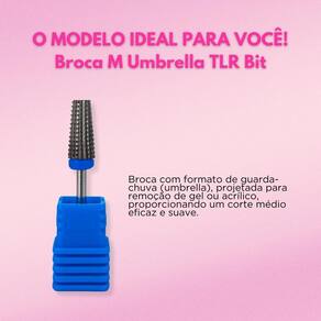 A Broca de Manicure M Umbrella TLR Bit é indispensável para o atendimento, entregando excelência para remover gel, acrílico ou outros produtos em camadas mais espessas, com seu corte médio, permite uma remoção eficaz sem comprometer o leito da unha. Possui um design especializados, permitindo que as manicures e nail designers realizem seu trabalho com mais eficiência e precisão.