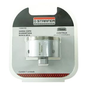 Especificações Técnicas: Tipo: Serra copo contínua diamantada Diâmetro: 75 mm Material do corpo: Aço carbono Tipo de lâmina: Contínua diamantada Rosca: M14 Compatibilidade: Esmerilhadeira (ou furadeira com adaptador Starfer) Embalagem: Blister duplo Marca: Starfer Ref.: 13006709